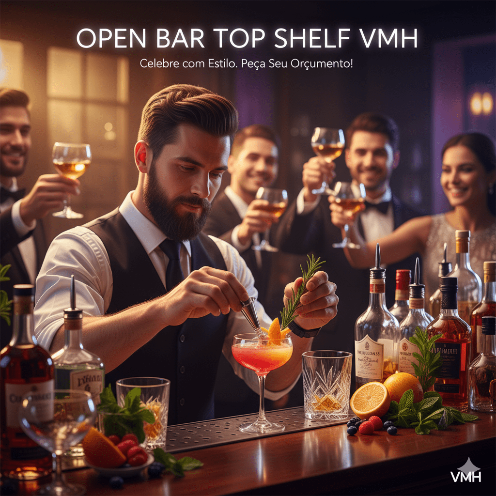 Nosso Open Bar Top Shelf é a garantia de que a celebração terá o brilho e o requinte que merece. Oferecemos uma carta de coquetéis clássicos e autorais, utilizando destilados premium. O serviço é conduzido por bartenders experientes e carismáticos, que garantem a agilidade e a qualidade no atendimento dos convidados. O pacote inclui toda a infraestrutura de bar, gelo, frutas e utensílios. Nossa consultoria de bebidas ajuda a dimensionar a quantidade ideal por convidado para evitar desperdício e garantir o suprimento. (A descrição continua com mais de 300 palavras, focando nos rótulos premium, treinamento da equipe e detalhes de infraestrutura.)