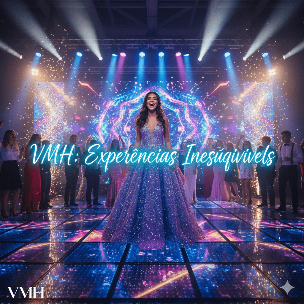 A Grande Estreia” é o pacote definitivo para celebrar os 15 anos com modernidade e estilo. A VMH entende que esta celebração é um marco de transição e merece uma produção que reflete a personalidade vibrante e atual da debutante. Este pacote foca em elementos de alta tecnologia e interatividade. Incluímos o Backdrop Digital LED para cenários dinâmicos e sessões de fotos espetaculares. Nossa equipe de produção especializada em festas jovens garante a logística de montagem e o alinhamento com as tendências mais atuais de entretenimento. A Pista de Dança Interativa (Novo SKU!) é o coração da festa, garantindo que a energia nunca acabe. Além disso, a segurança e o serviço de valet estão inclusos para a total tranquilidade dos pais e convidados. Com a VMH, os 15 anos não são apenas uma festa, mas um festival de luzes, som e emoções, construído para ser o assunto da cidade. São mais de 300 palavras dedicadas a prometer uma noite mágica, tecnológica e perfeitamente orquestrada.